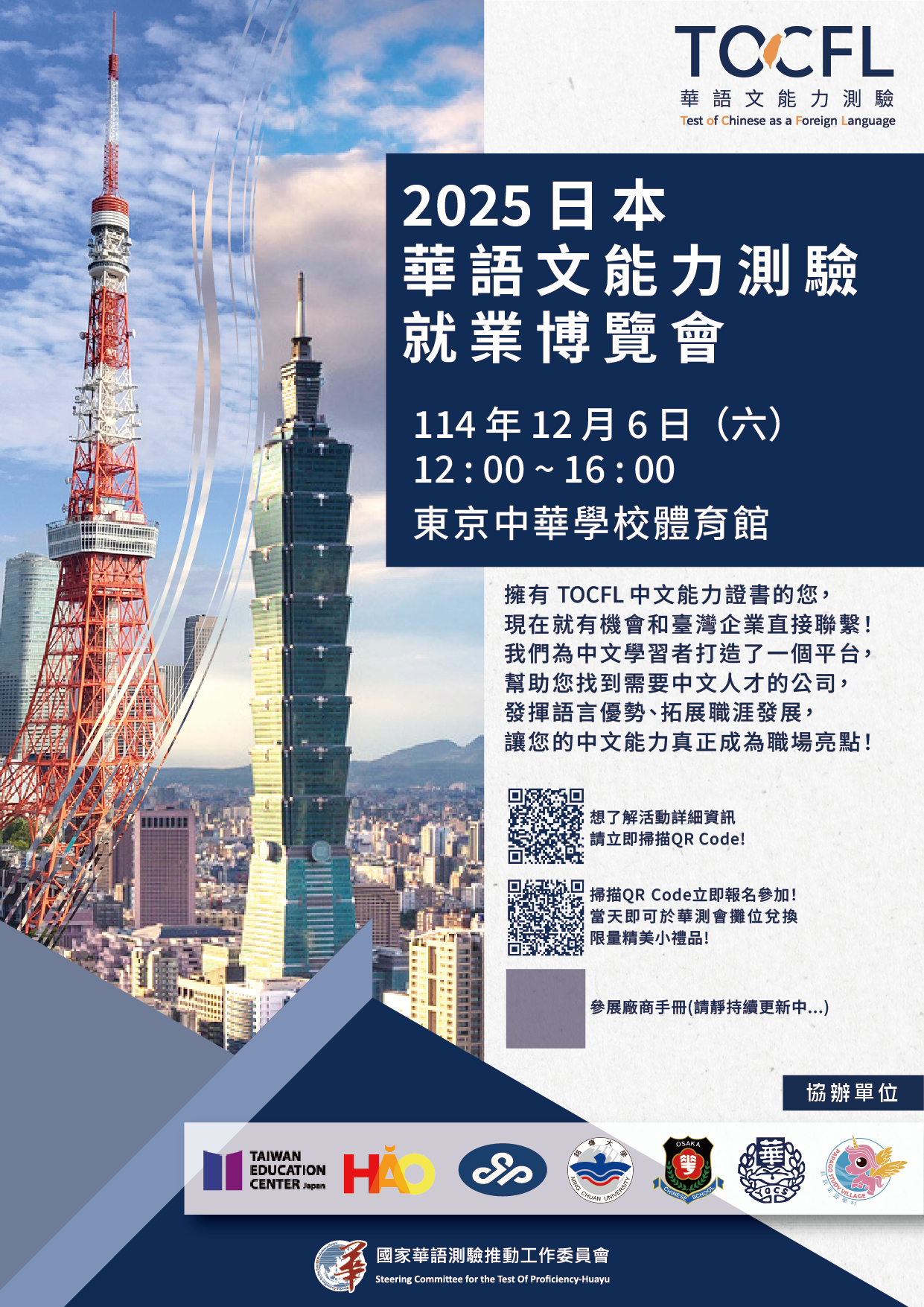 • 【校友服務中心】2025年日本地區「華語文能力測驗就業博覽會」,歡迎日籍畢業校友踴躍參加!